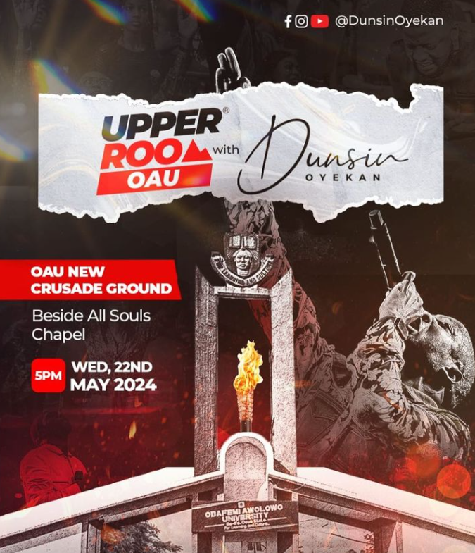 Upper Room with Minister Dunsin Oyekan is coming to you on Wednesday, May 22nd 2024. The venue is the new OAU crusade ground, beside All Souls Chapel. It is scheduled to begin at 5 pm, but you could make it earlier, if you are able.