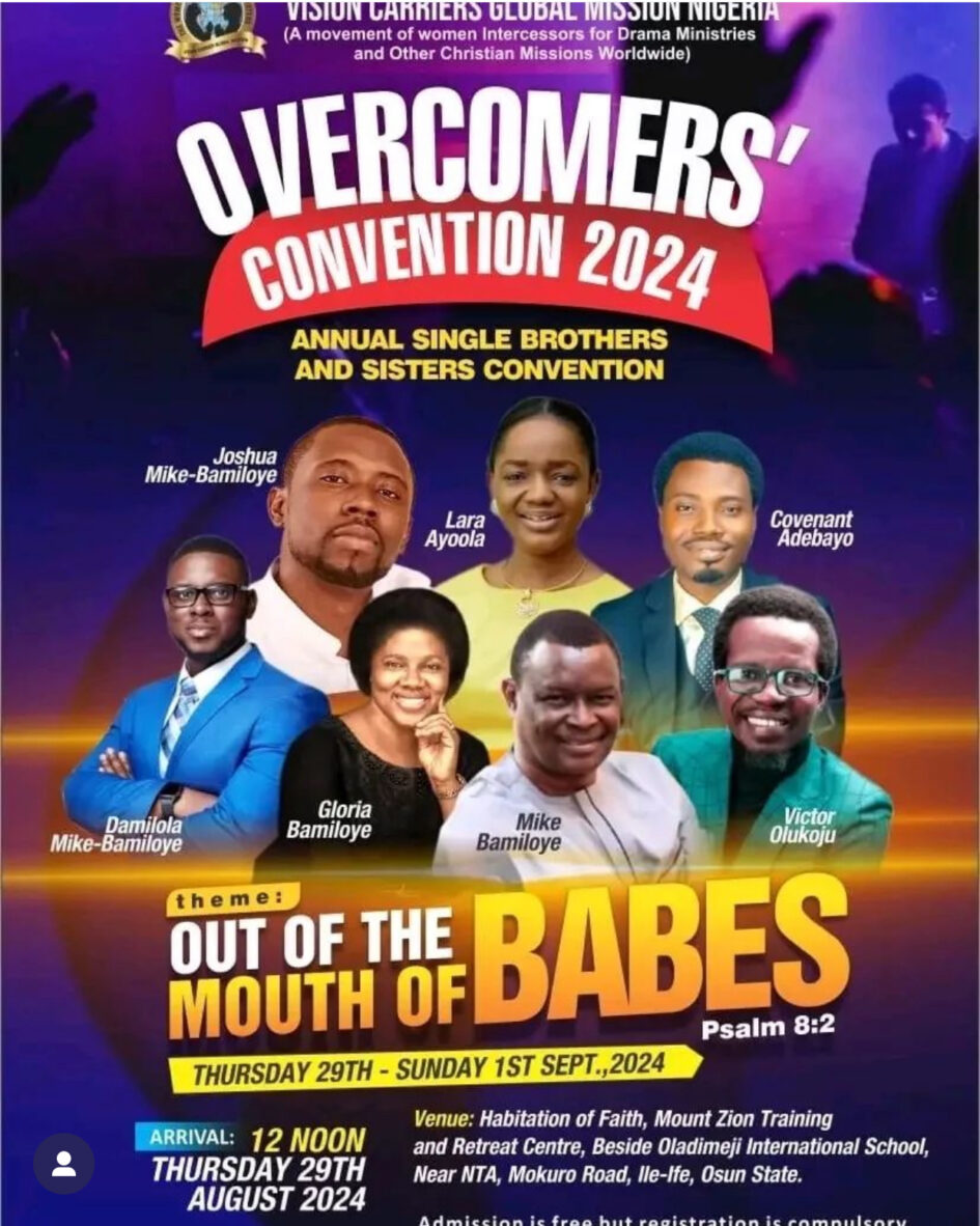 The Mount Zion Ministry invites all single brothers and sisters to their Vision Carriers Global Missions’ Overcomers Convention 2024 tagged ‘Out of the Mouth of Babes.’