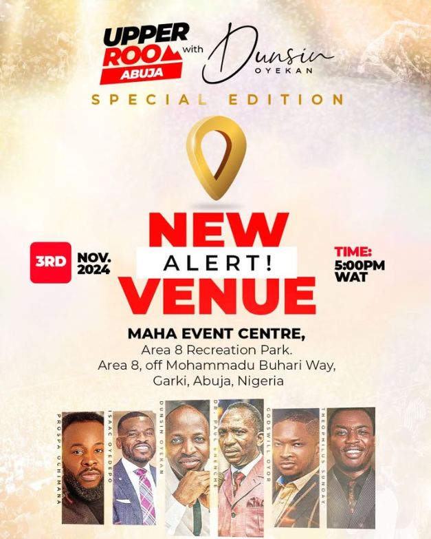 If Minister Dunsin’s ministry has been a blessing to you, and you are in Abuja or environs, please make your way to Maha Event Centre on Sunday, November 3, to celebrate God with him.